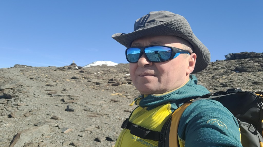 Śniegu było coraz więcej. Przy pięknej słonecznej pogodzie trasa nie stanowi większego problemu, jednak pewnym utrudnieniem jest brak widocznej trasy. Po drode mam do pokonania kilka wzniesień i za każdym razem gdy wydaje mi się że to już szczyt, przed moimi oczami staje następne wypiętrzenie. Wraz ze zdobywaniem wysokości ubywa również tlenu w powietrzu i mimo tego że kolejne metry pokonuję przy dość łagodnym nachyleniu, pojawia się zmęczenie. Pod samym szczytem nachylenie nieco wzrasta jednak śnieg dobrze trzymał i nie musiałem zakładać raków taszczonych w plecaku na szczyt 🤣.