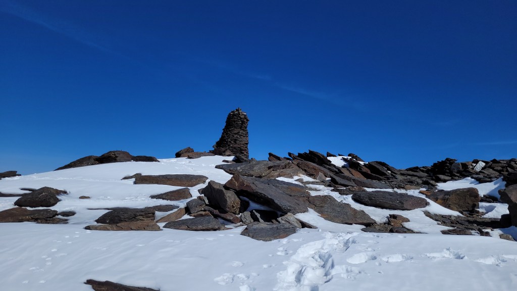 Sterta ułozonych kamieni oraz betonowy słupek poinformował mnie, że osiągnąłem wysokość 3479 m.n.p.m. i tym samym jestem na najwyższym kontynentalnym szczycie Hiszpanii. Słup znajduje się na platformie na którą trzeba się spiać jakieś dwa metry jednak dzisiaj przy tej ilości śniegu mam ułatwione zadanie. Jedyny minus to to że nie zobaczę kapliczki która znajduje się u jej podstawy, a teraz jest teraz zasypana. Wszystko to jednak staje się mało istotne przy tym przepięknym widoku jaki roztacza się ze szczytu. Pod platformą na której stoję zieje 500 metrowa przepaść, a dalej tylko góry.