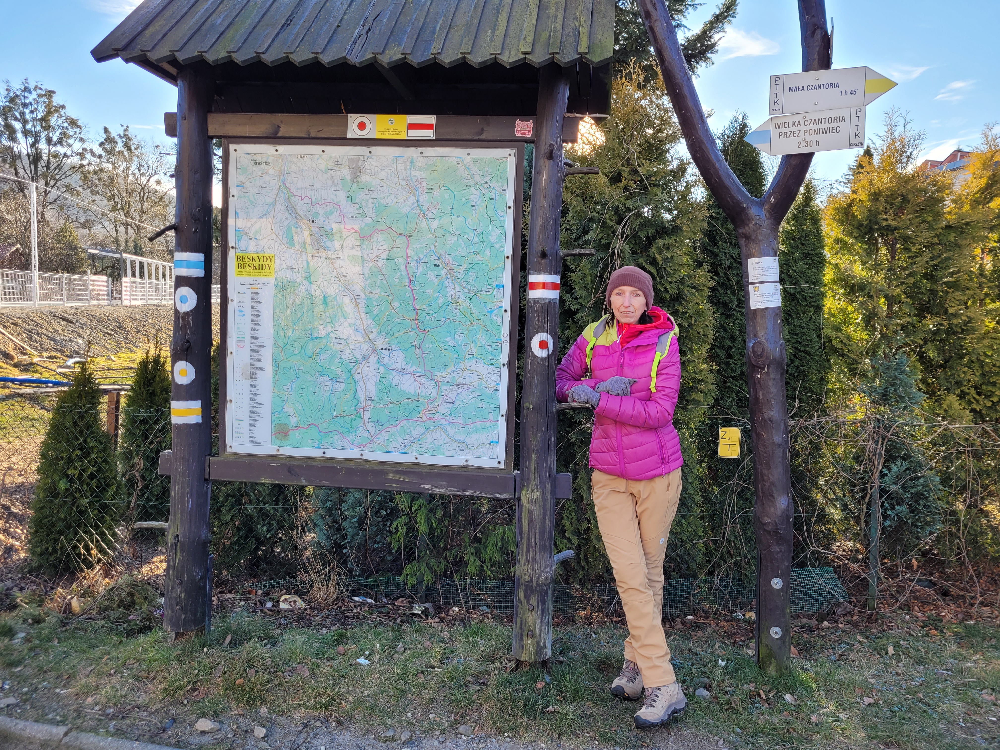 Tutaj spotykam się z Marysią która wróciła do Ustronia i dojechła tutaj samochodem, idziemy do Dworu Skibówki na kawę i rozstajemy się po raz drugi dzisiejszego dnia. Schodzę na dół na własnych nogach, Marysia zjeżdża na czterech kółkach.Obok gościńca znajduje się drogowskaz informujący o szlakach turystycznych. Można stąd iść m.in. na Orłową, Błatnią, czy do Brennej, ja oczywiście wybieram szlak czerwony, który w 1 godzinę powinien zaprowadzić mnie do Ustronia Polany.