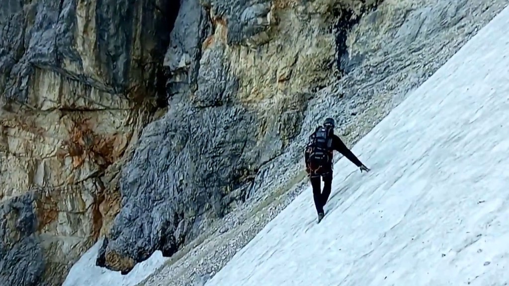 W momencie, gdy skończyły się stalowe liny, przez chwilę zastanawiamy się co dalej , gdyż dalszy przebieg szlaku nie jest jednoznaczny a zalegający śnieg nie ułatwia nam nawigacji i mamy mały problem z dotarciem do dalszej części ferraty. Schodzimy jednak nieco w dół, a następnie skręcamy w prawo i trawersujemy potężną rynnę.